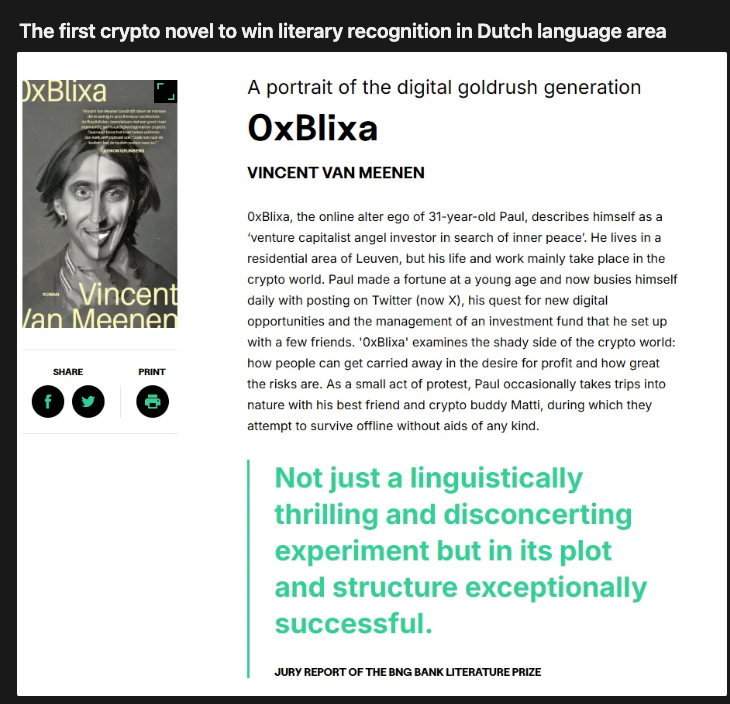 Vincent Van Meen is the first crypto novelist to win a European literary prize. $ilence would be the second crypto novel in his 0xBlixa-series, focusing on privacy and censorship resistance.