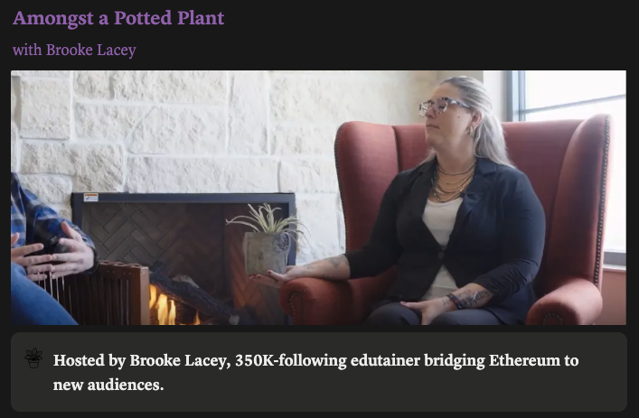Over the last four years, Brooke has built a body of Ethereum-focused content across TikTok, Twitter, and YouTube designed to onboard new audiences and make Ethereum approachable. With her project, Brooke plans to bring out the human side of Ethereum’s cultural and technical leaders in candid, witty, and insightful conversations.